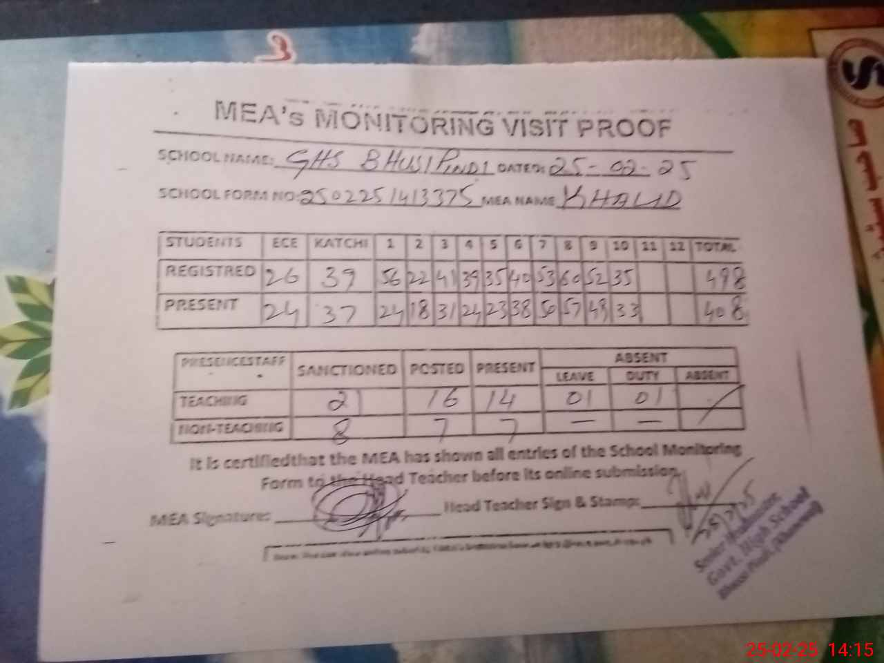 | Attendance Register | Head Teacher | MEA with School | Visit Proof |