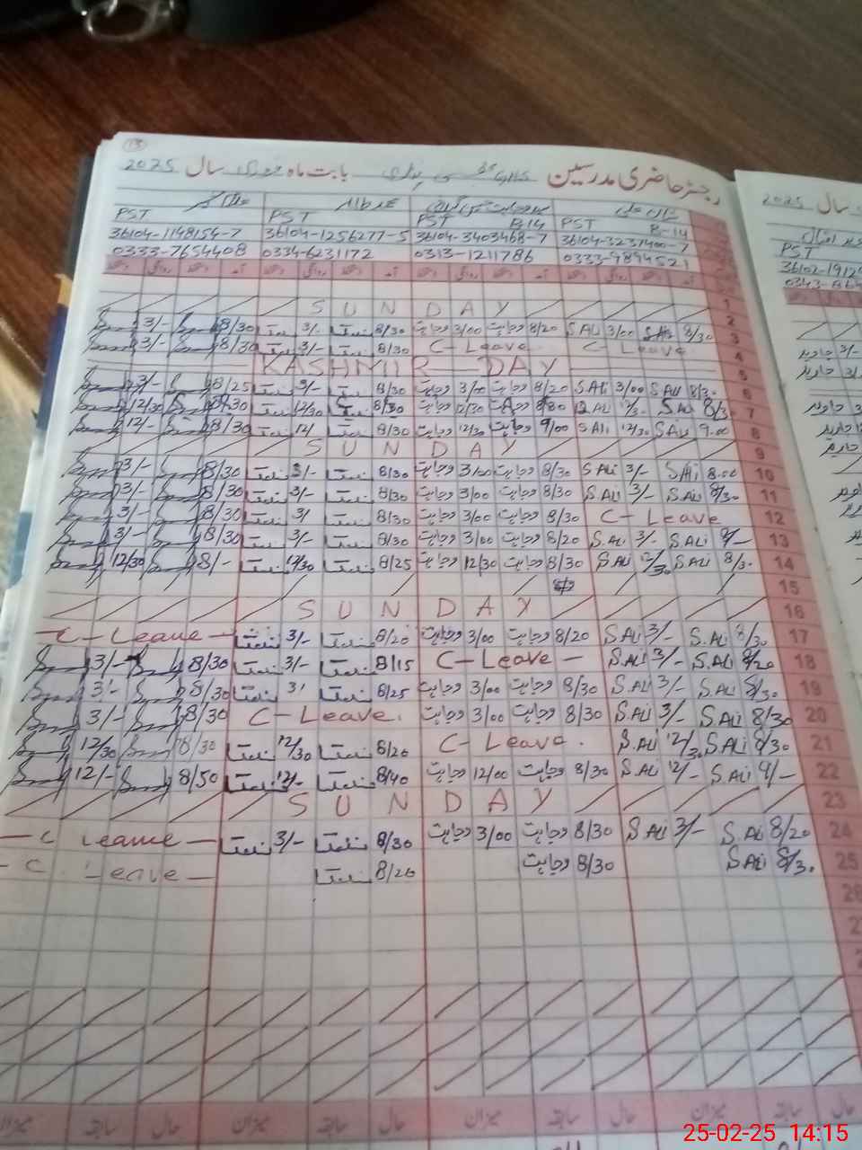 | CNIC | Full Name | Designation | R/C | Absence During Last Calender Month |