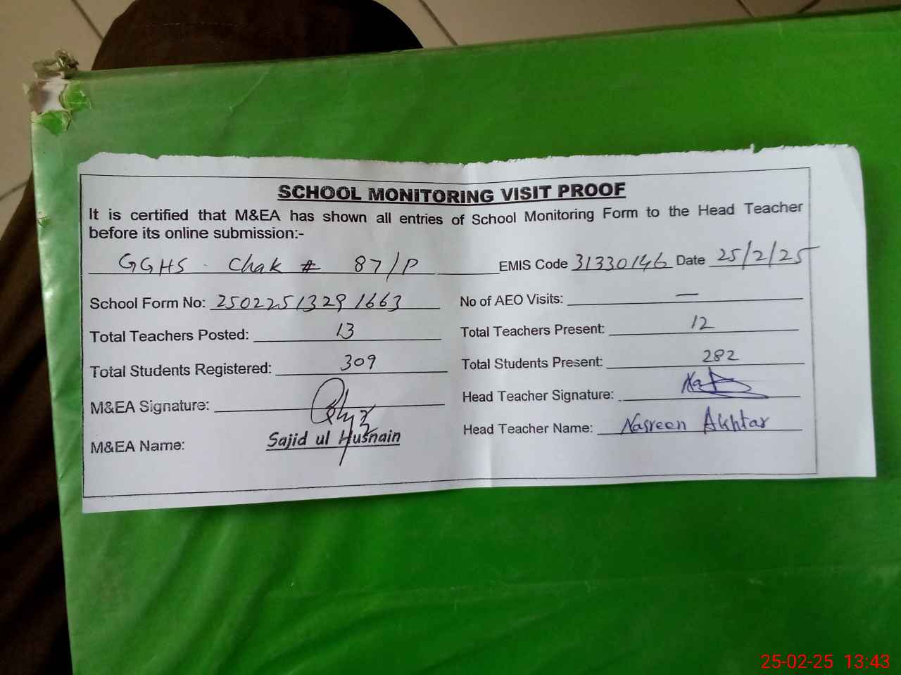 | EMIS Code: 31330146 | Name of School: GGHS CHAK NO. 87/P | |||