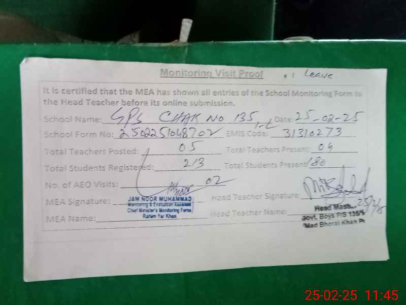 | EMIS Code: 31310273 | Name of School: GPS CHAK NO. 135/1-L (After Noon) | |||