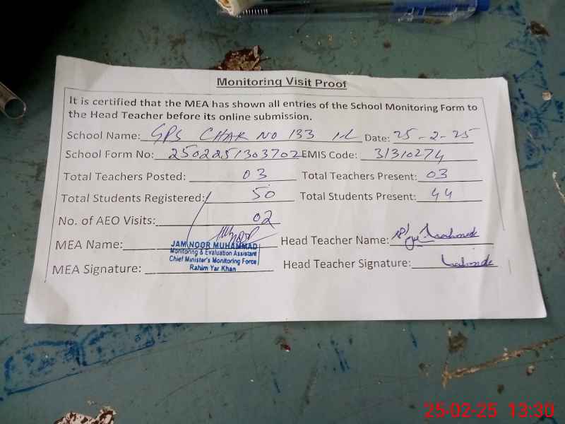 | EMIS Code: 31310274 | Name of School: GPS CHAK NO. 133/1-L | |||