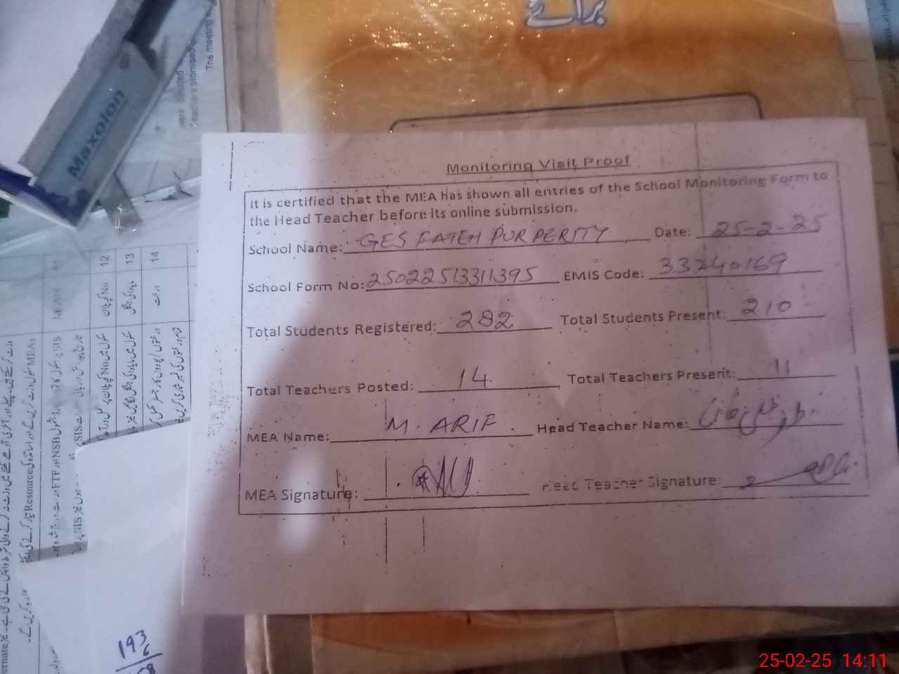 | EMIS Code: 33240169 | Name of School: GES FATEH PUR PARITY | |||