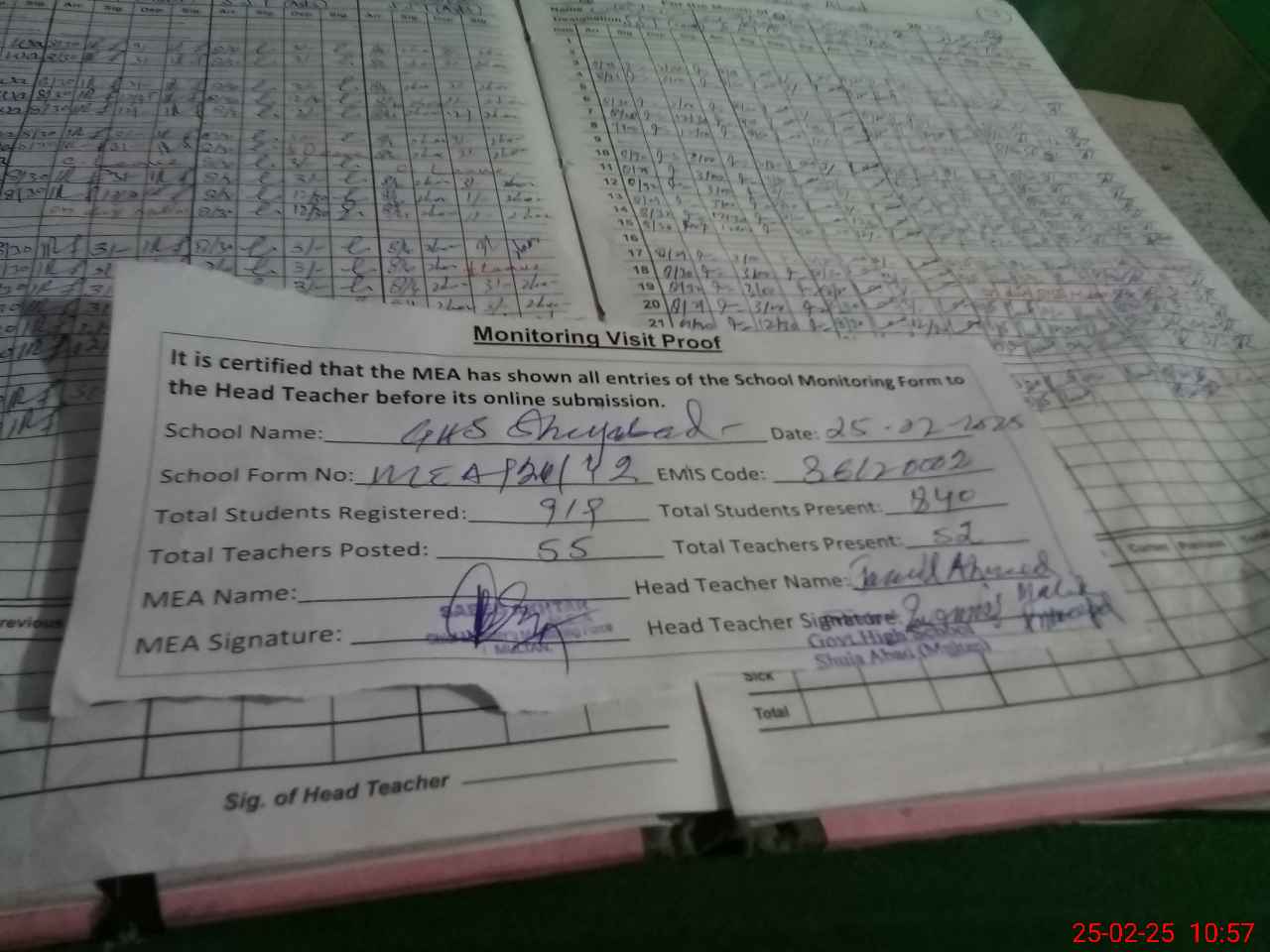 | Attendance Register | Head Teacher | MEA with School | Visit Proof |