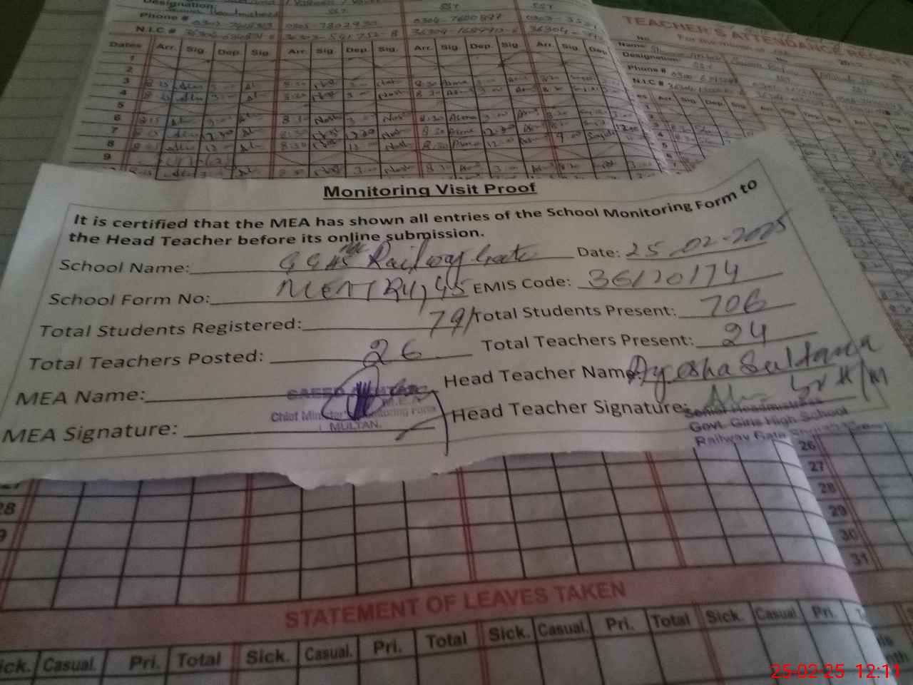 | EMIS Code: 36120174 | Name of School: GGHS MC RAILWAY GATE SHUJABAD | |||