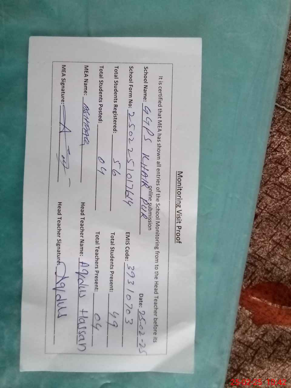 | Attendance Register | Head Teacher | MEA with School | Visit Proof |
