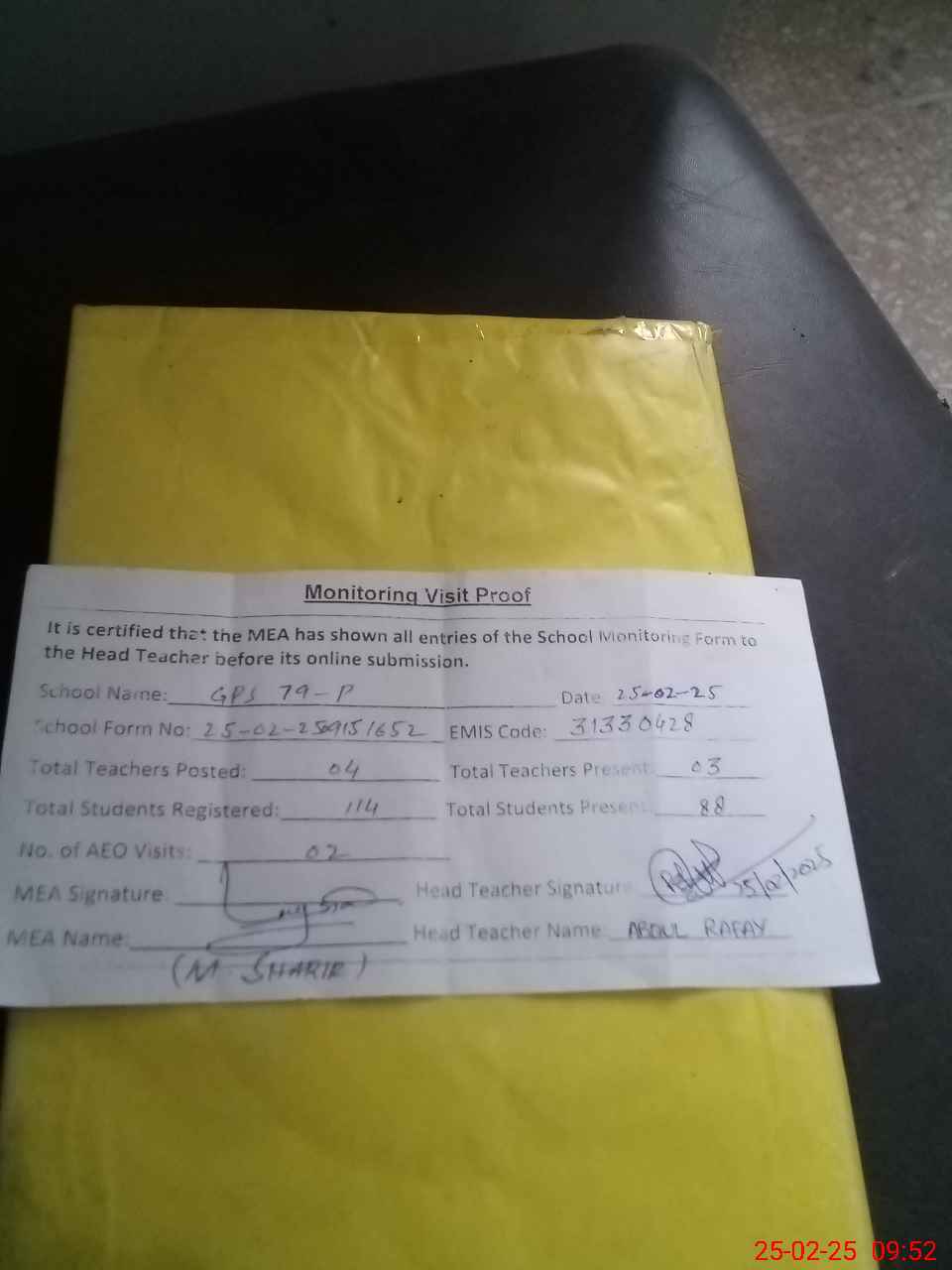 | Attendance Register | Head Teacher | MEA with School | Visit Proof |