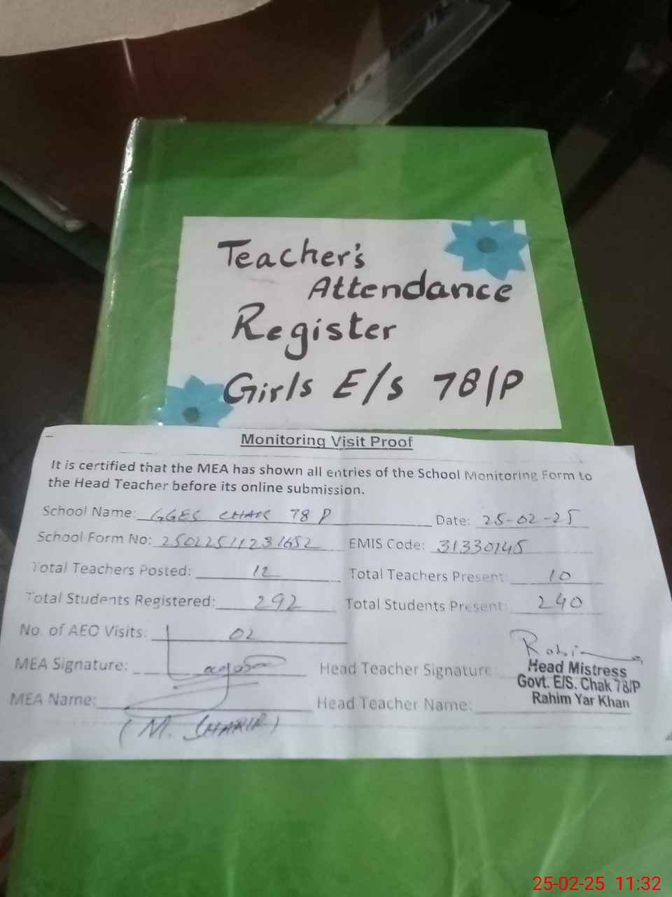 | Attendance Register | Head Teacher | MEA with School | Visit Proof |