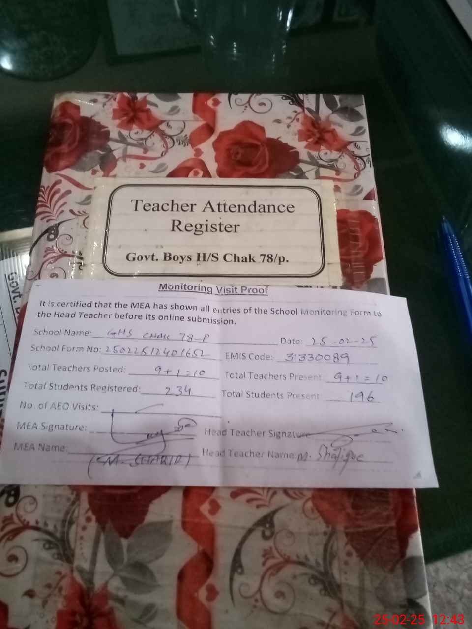 | Attendance Register | Head Teacher | MEA with School | Visit Proof |