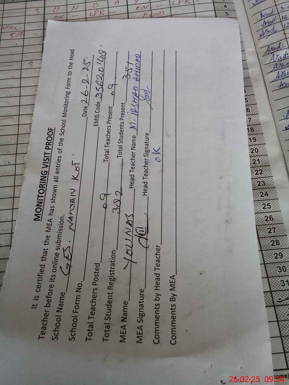 | Attendance Register | Head Teacher | MEA with School | Visit Proof |