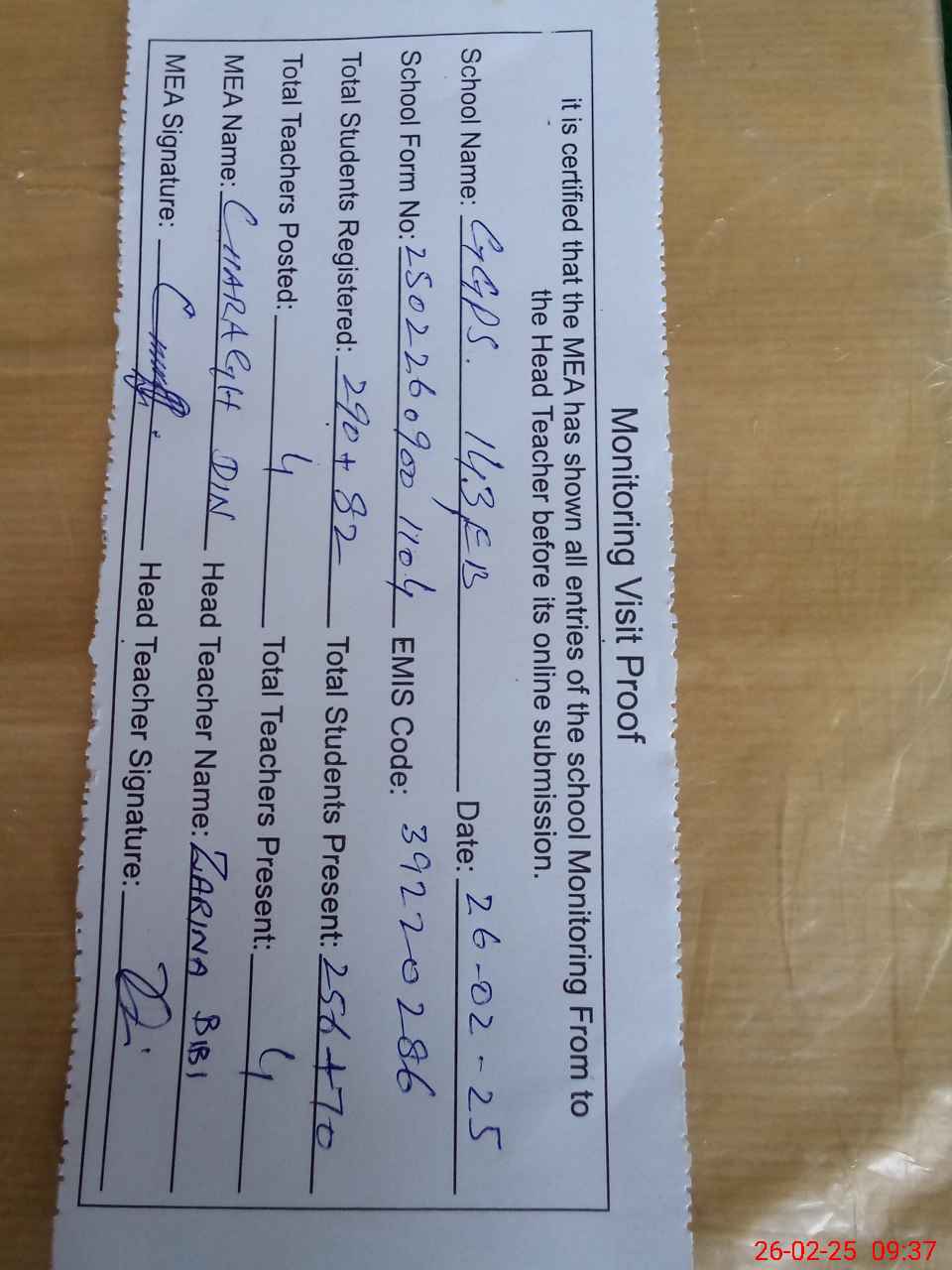 | Attendance Register | Head Teacher | MEA with School | Visit Proof |