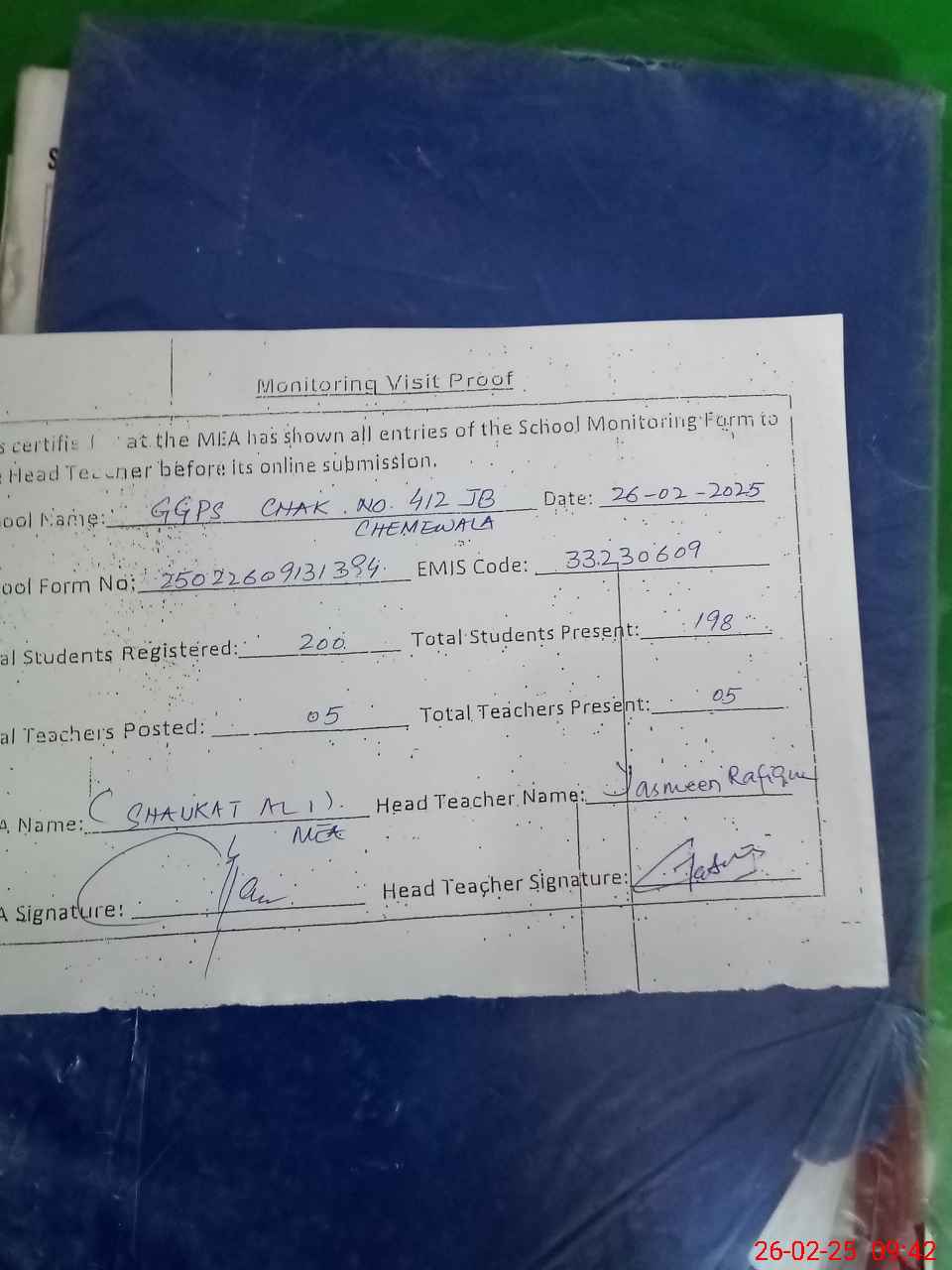 | Attendance Register | Head Teacher | MEA with School | Visit Proof |