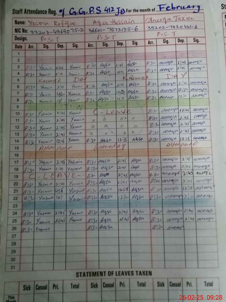 | CNIC | Full Name | Designation | R/C | Absence During Last Calender Month |