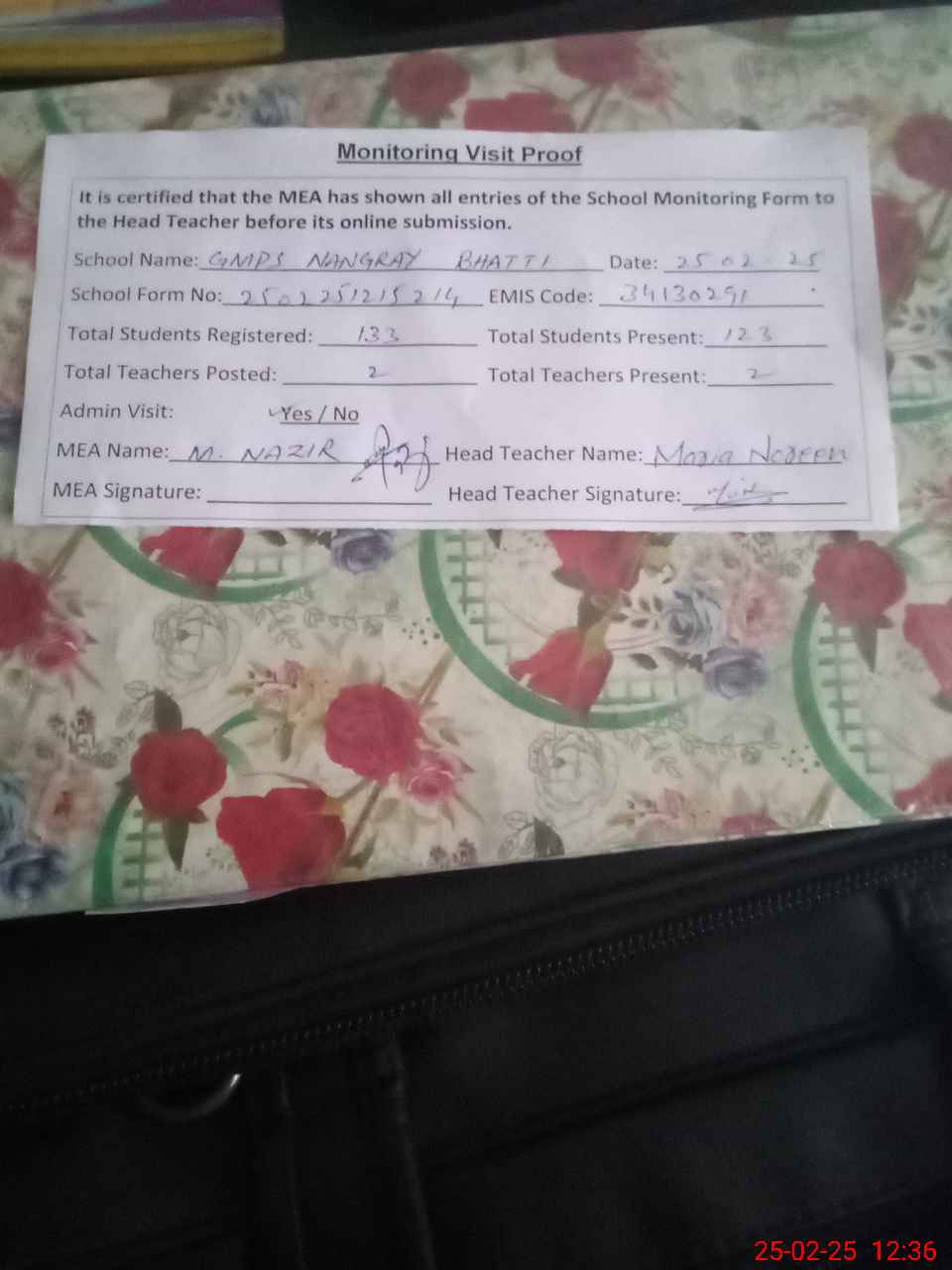 | EMIS Code: 34130291 | Name of School: GMPS NAGREY BHATTI | |||