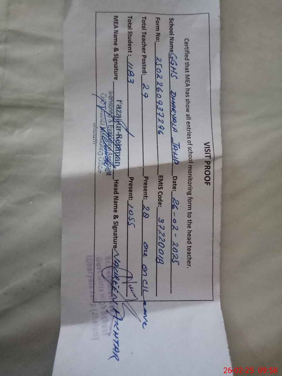 | EMIS Code: 37220018 | Name of School: GGHS DHARIALA JALIB | |||