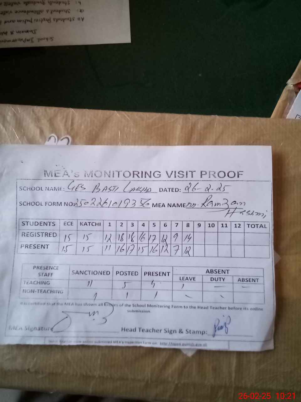 | Attendance Register | Head Teacher | MEA with School | Visit Proof |