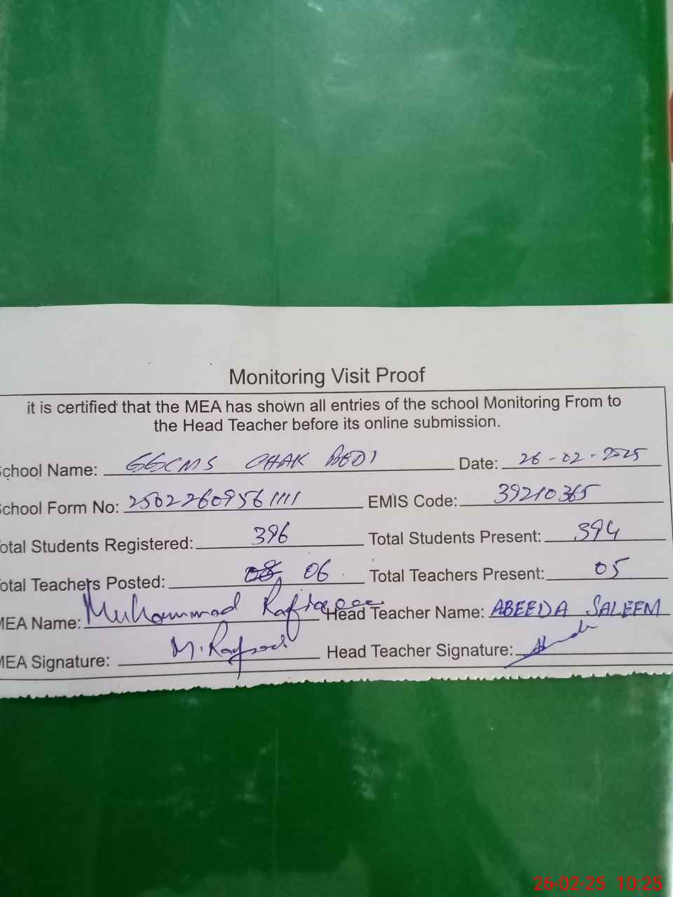 | Certified that this School was Inspected by the Undersigned MEA/DMO Today and the Information Stated Above is as Per Record. | |||||