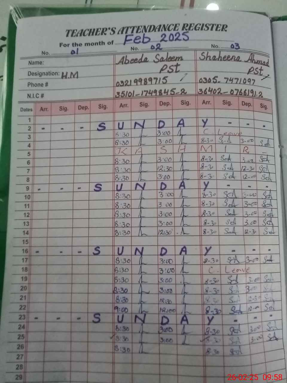 | CNIC | Full Name | Designation | R/C | Absence During Last Calender Month |