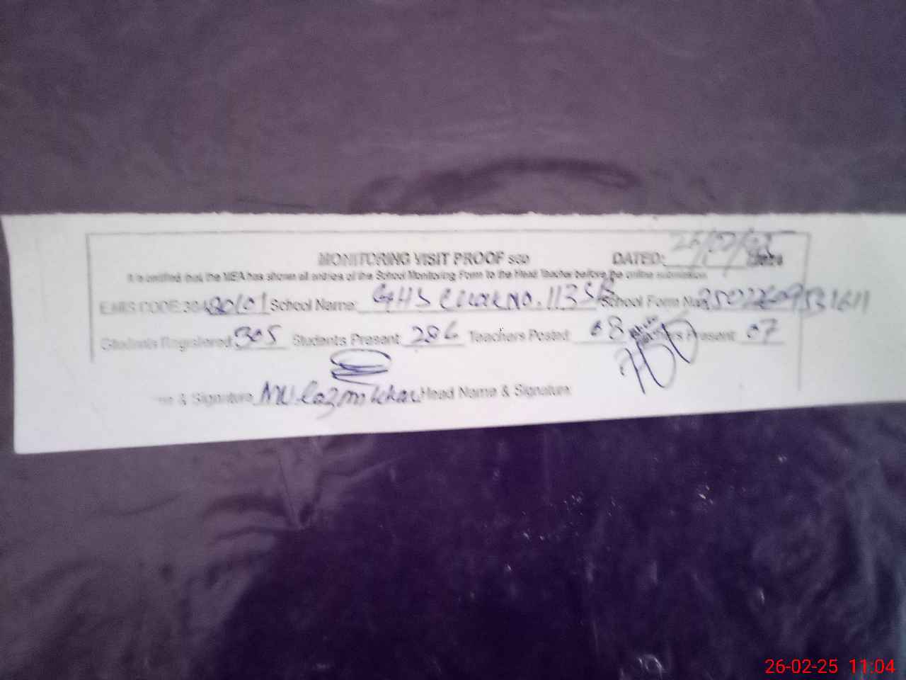 | Attendance Register | Head Teacher | MEA with School | Visit Proof |