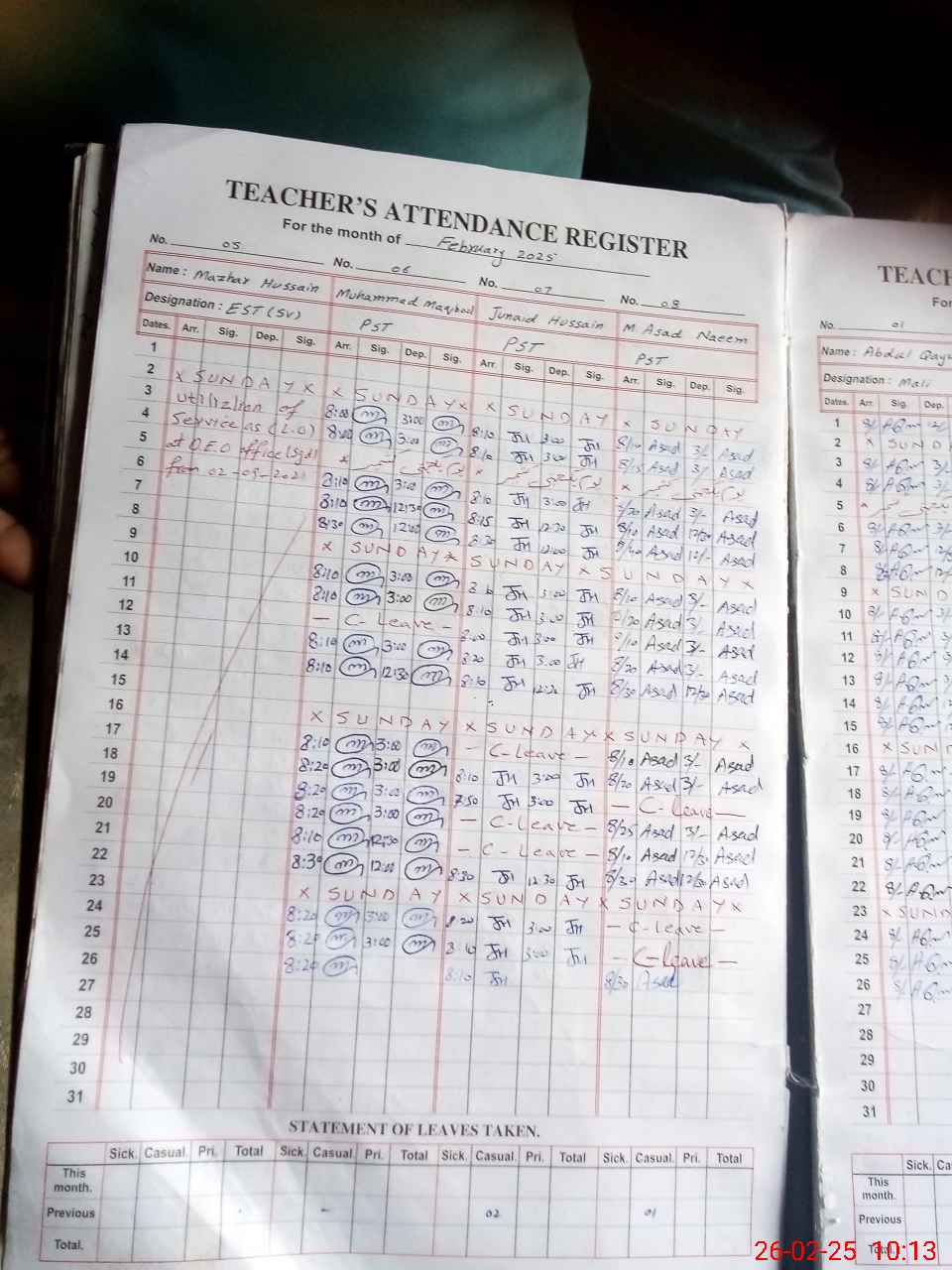 | CNIC | Full Name | Designation | R/C | Absence During Last Calender Month |