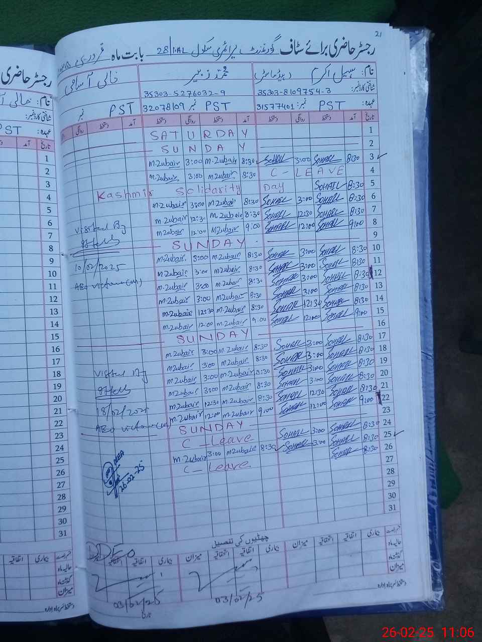 | CNIC | Full Name | Designation | R/C | Absence During Last Calender Month |