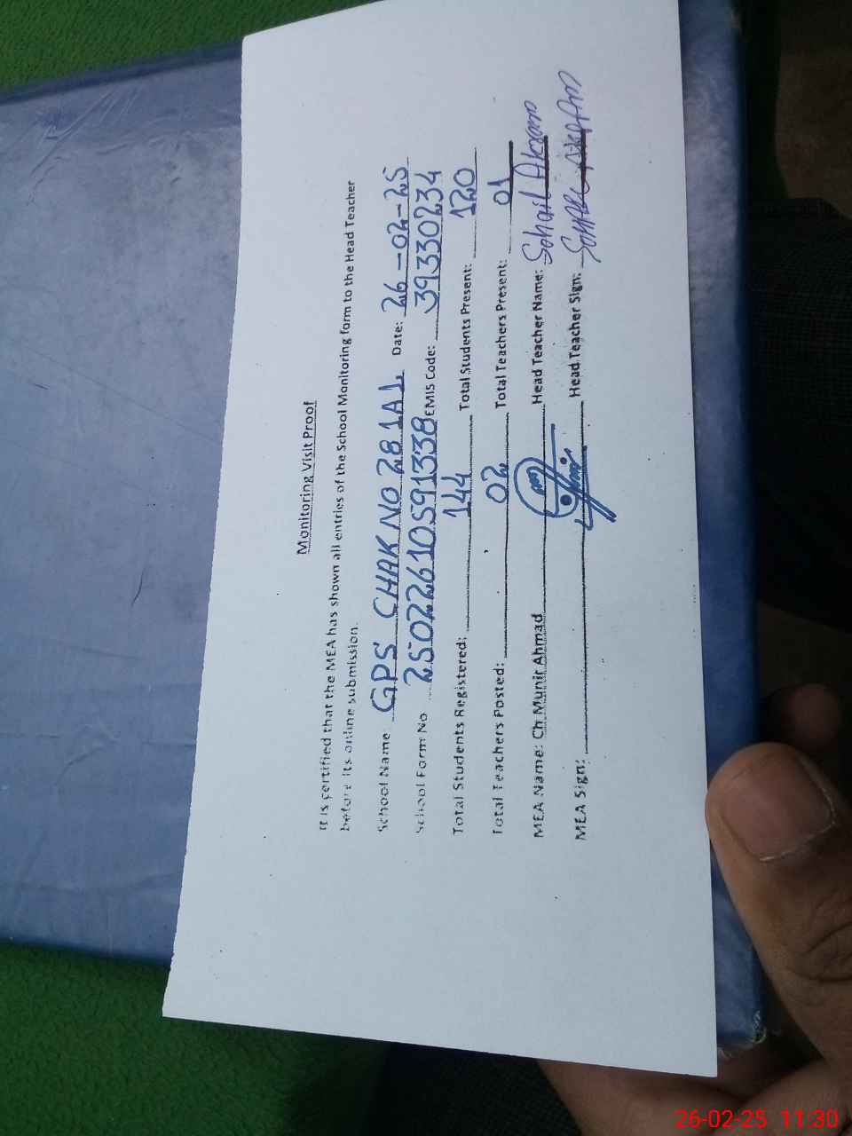 | Attendance Register | Head Teacher | MEA with School | Visit Proof |