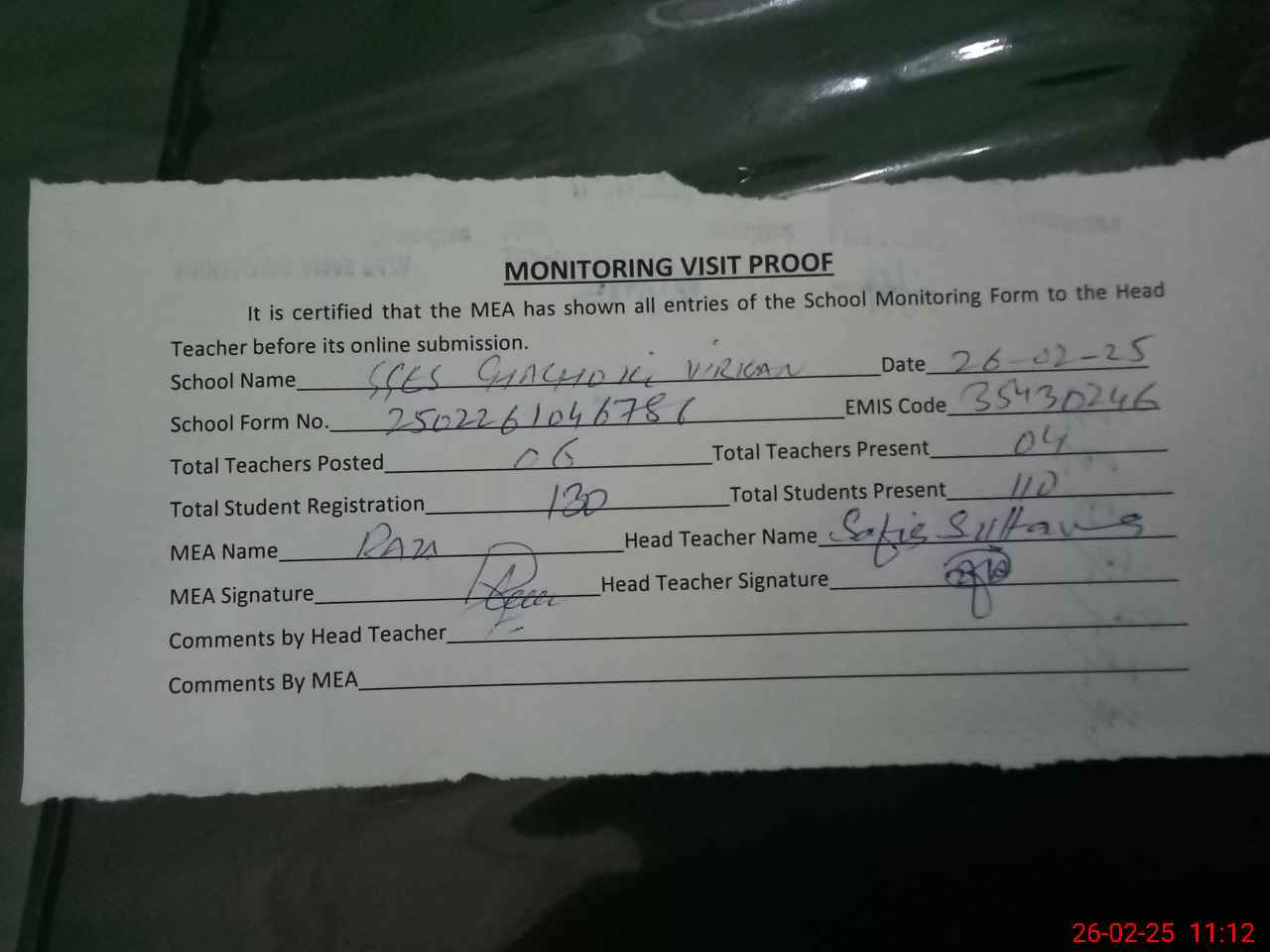 | Attendance Register | Head Teacher | MEA with School | Visit Proof |