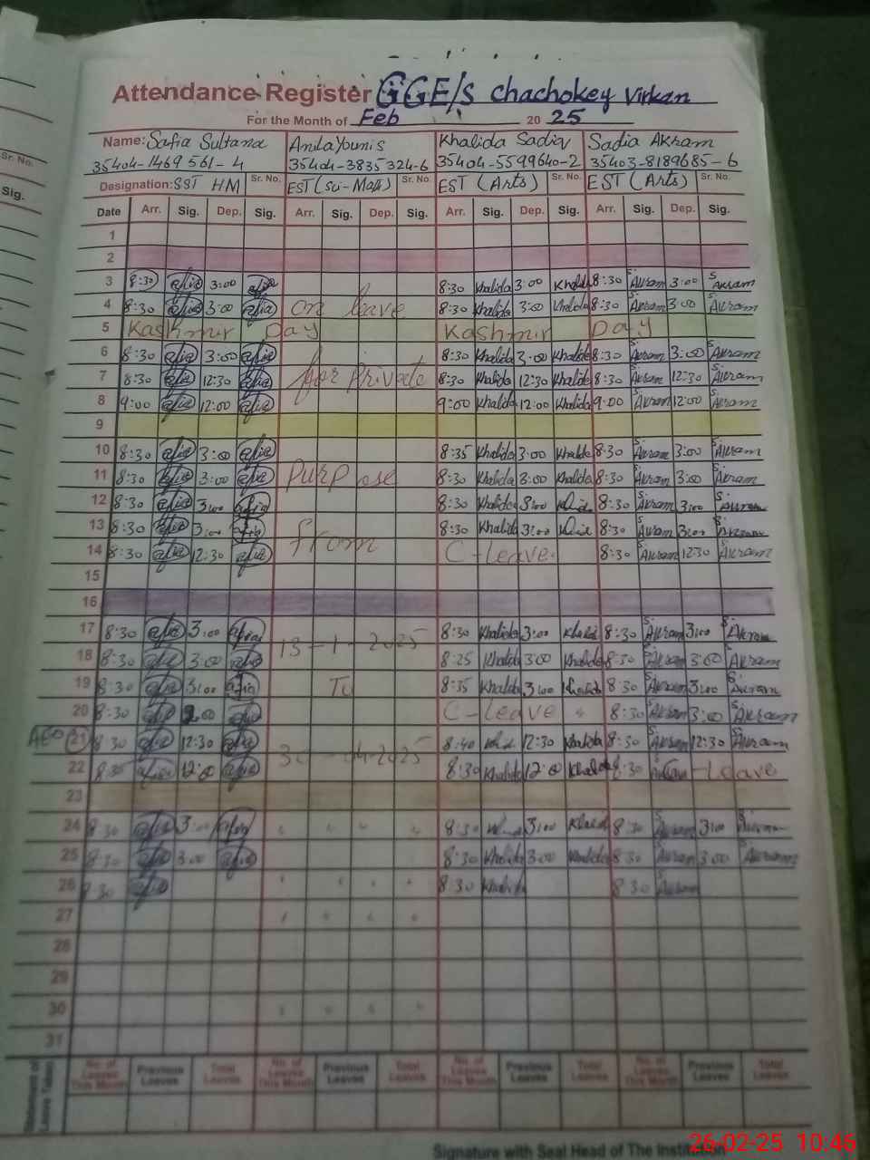 | CNIC | Full Name | Designation | R/C | Absence during last cal. month |