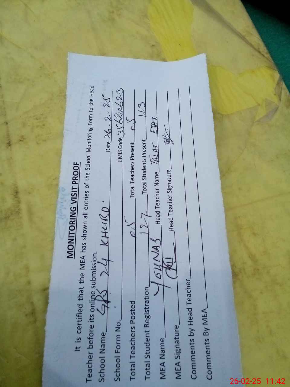 | Attendance Register | Head Teacher | MEA with School | Visit Proof |