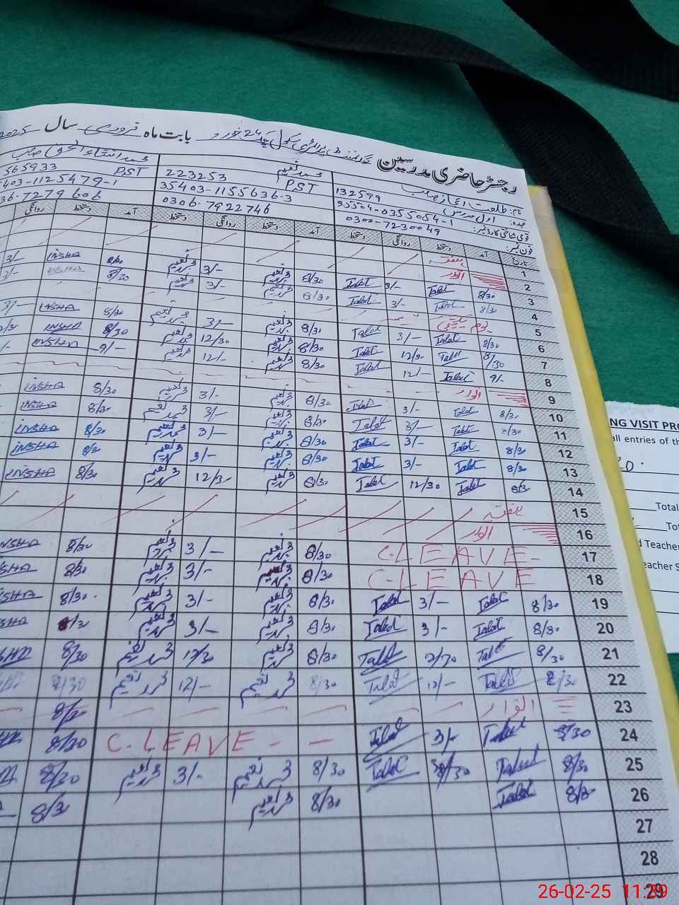 | CNIC | Full Name | Designation | R/C | Absence During Last Calender Month |