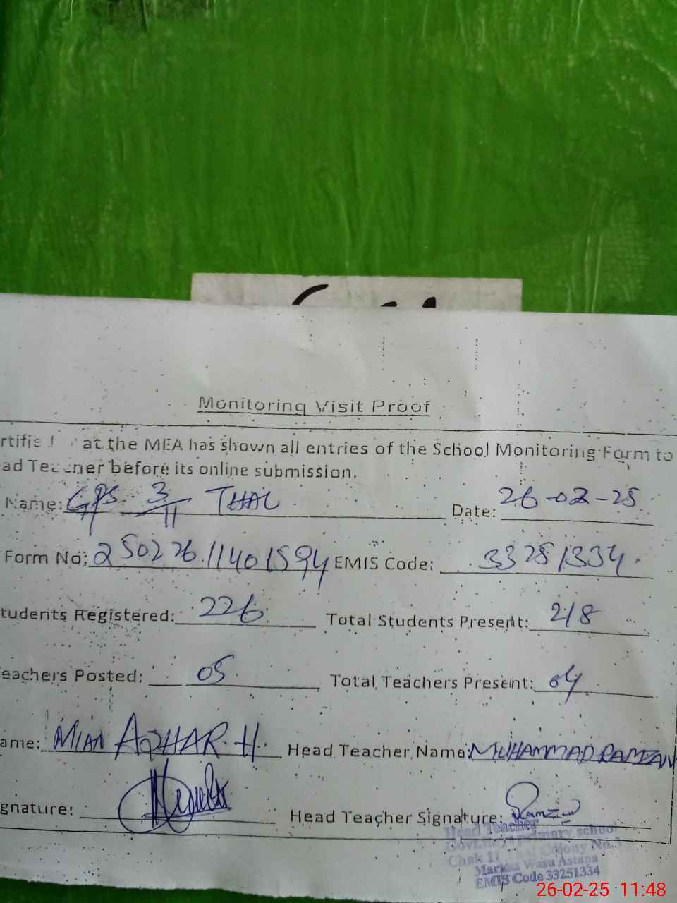 | EMIS Code: 33251334 | Name of School: GPS CHAK 11 THAL COLONY NO 3 | |||