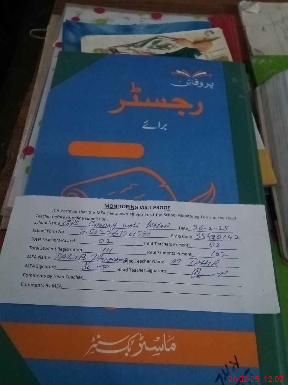 | Attendance Register | Head Teacher | MEA with School | Visit Proof |