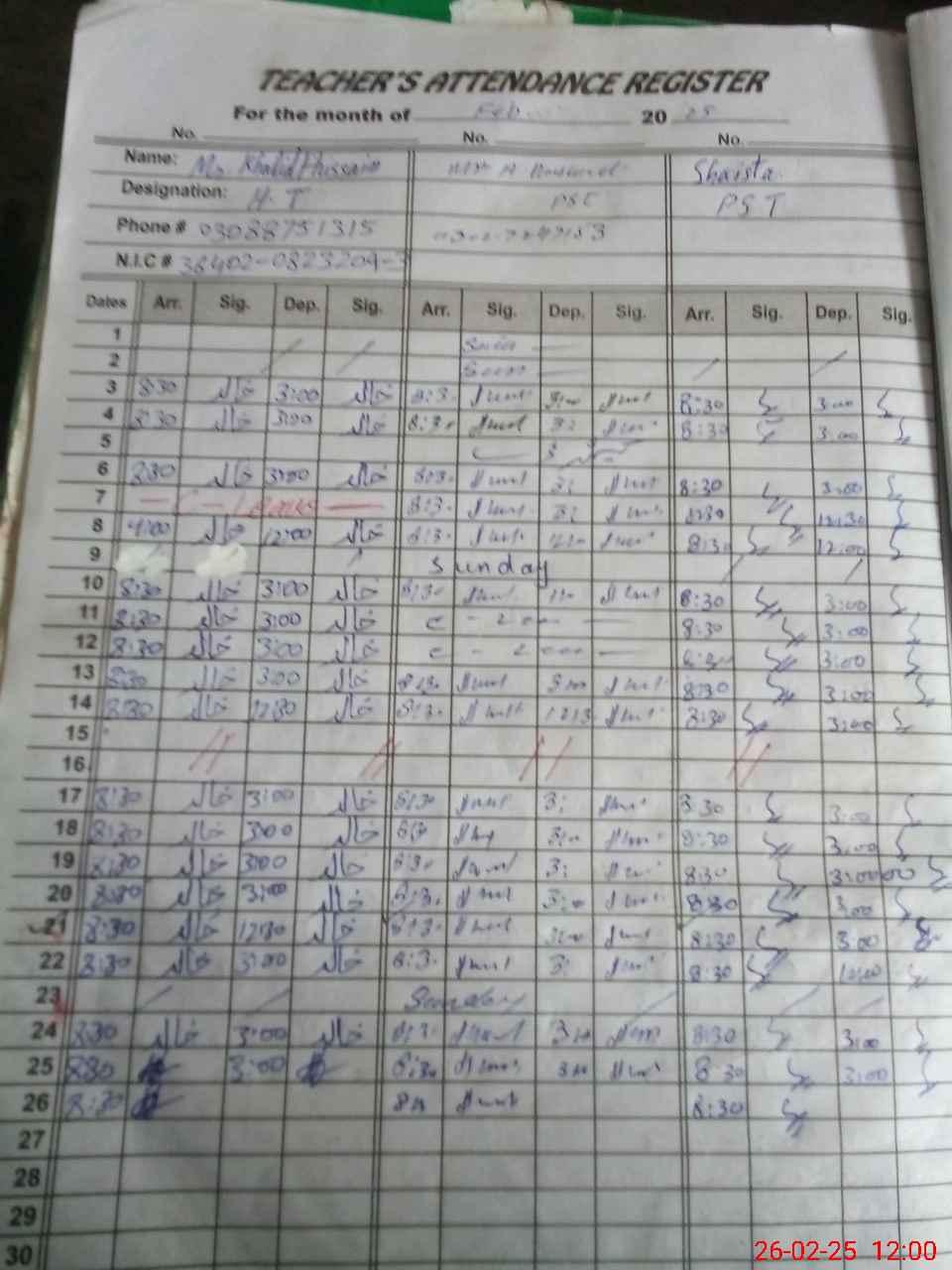 | Name: Kh**** Hu**** Designation: (School Headmaster's/Headmistress's) PST Phone/Cell Number: 03**** |