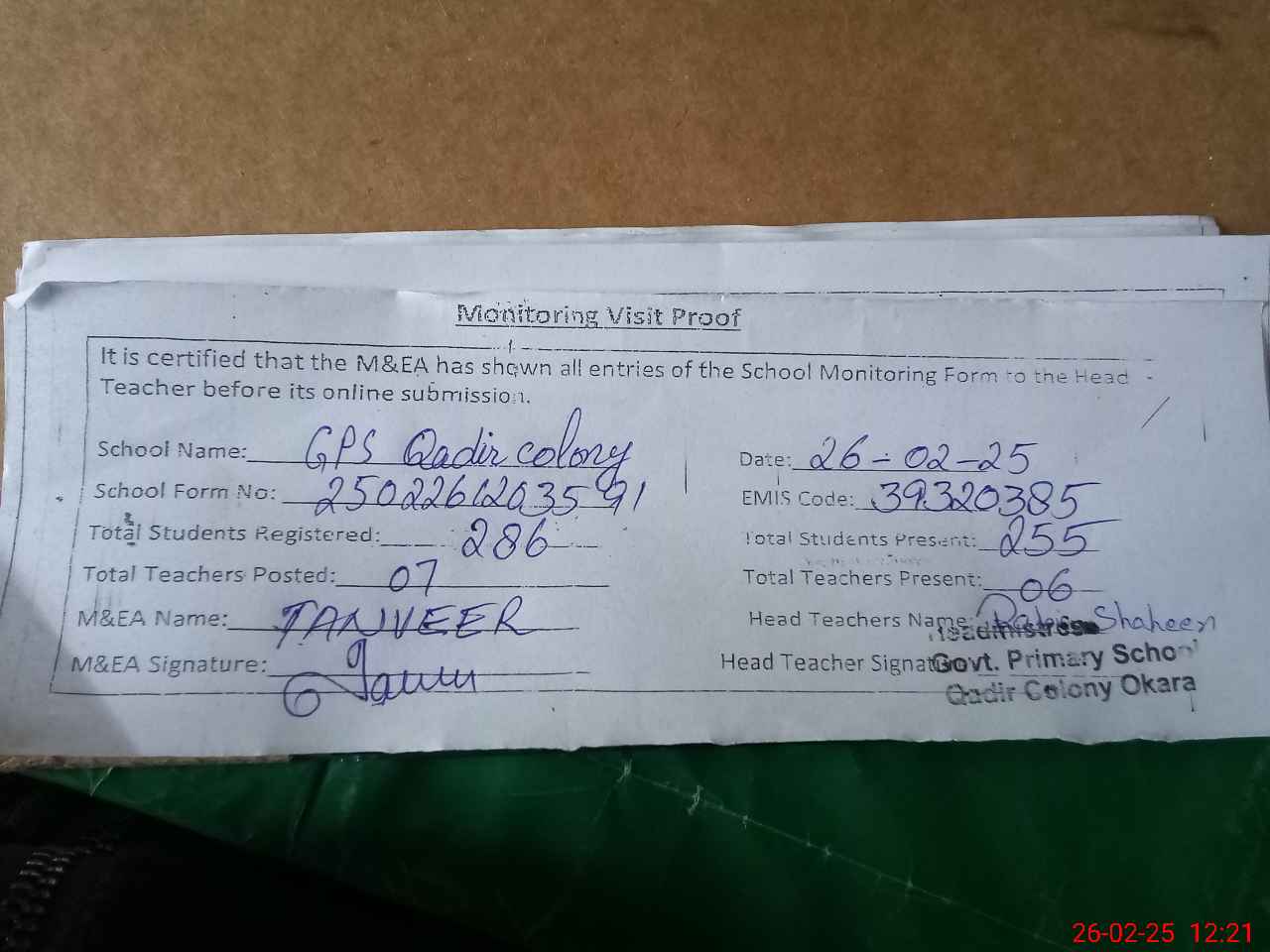 | EMIS Code: 39320385 | Name of School: GPS QADIR COLONY OKARA | |||