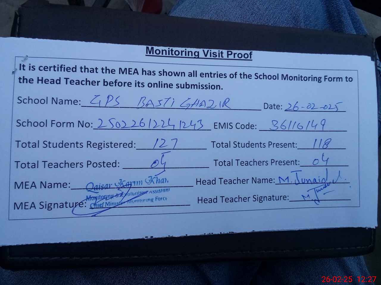 | EMIS Code: 36110149 | Name of School: GPS BASTI GHAZAR P/O MUZAFAARABAD | |||