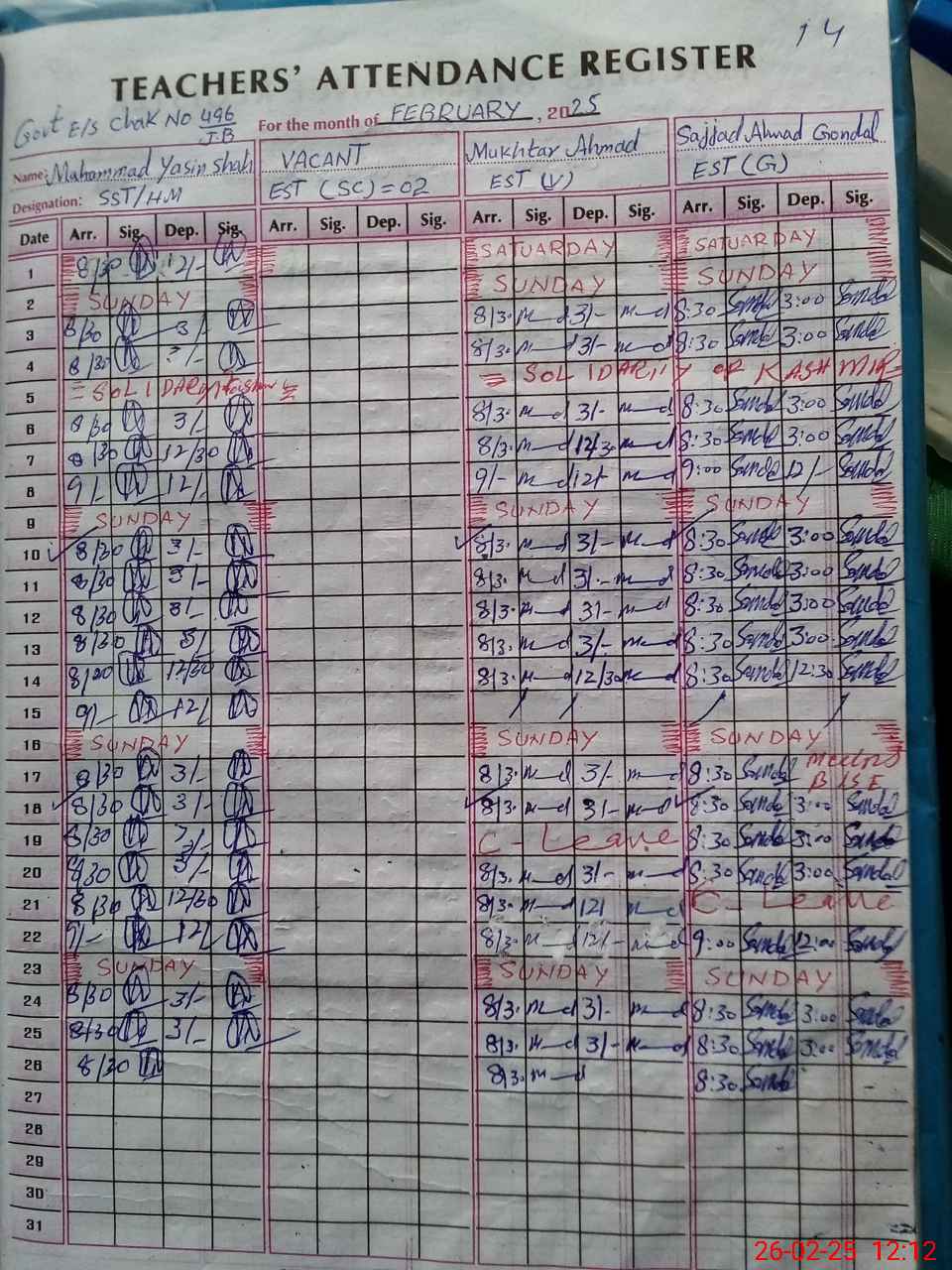 | CNIC | Full Name | Designation | R/C | Absence During Last Calender Month |