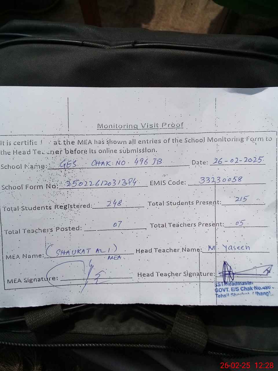 | Attendance Register | Head Teacher | MEA with School | Visit Proof |