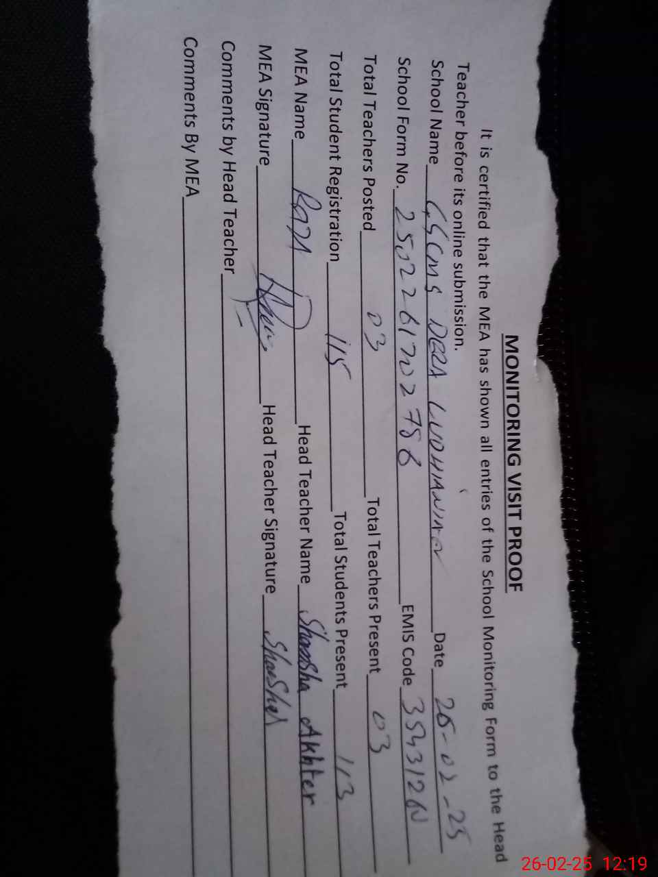 | Attendance Register | Head Teacher | MEA with School | Visit Proof |