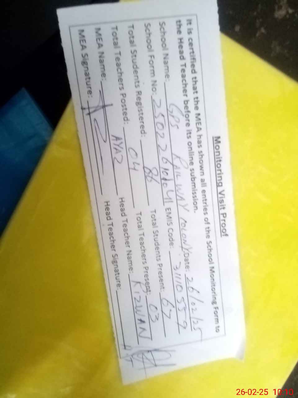 | Attendance Register | Head Teacher | MEA with School | Visit Proof |