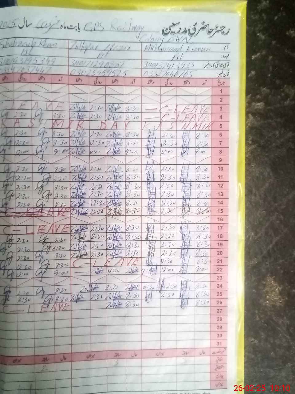 | CNIC | Full Name | Designation | R/C | Absence During Last Calender Month |