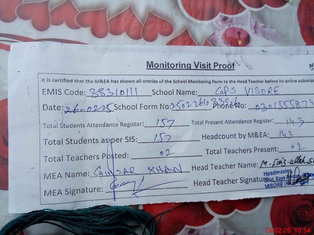 | Attendance Register | Head Teacher | MEA with School | Visit Proof |