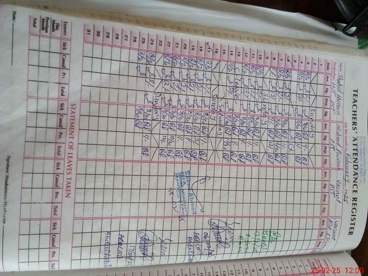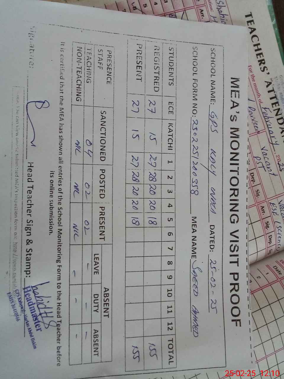 | Attendance Register | Head Teacher | MEA with School | Visit Proof |