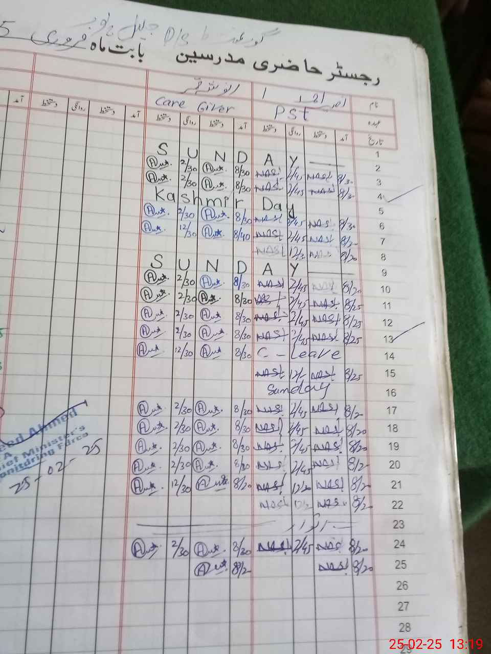 | CNIC | Full Name | Designation | R/C | Absence During Last Calender Month |