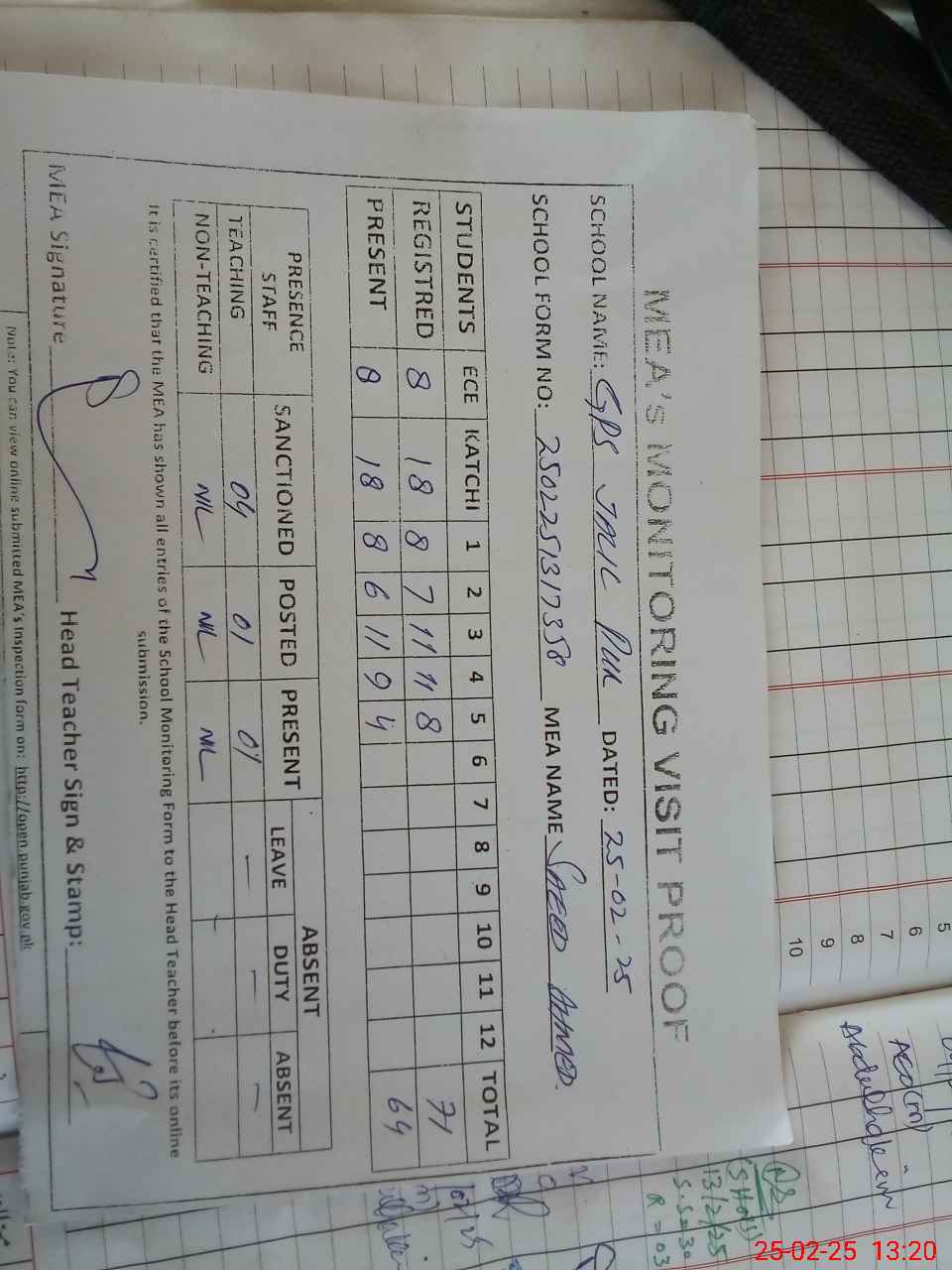 | Attendance Register | Head Teacher | MEA with School | Visit Proof |