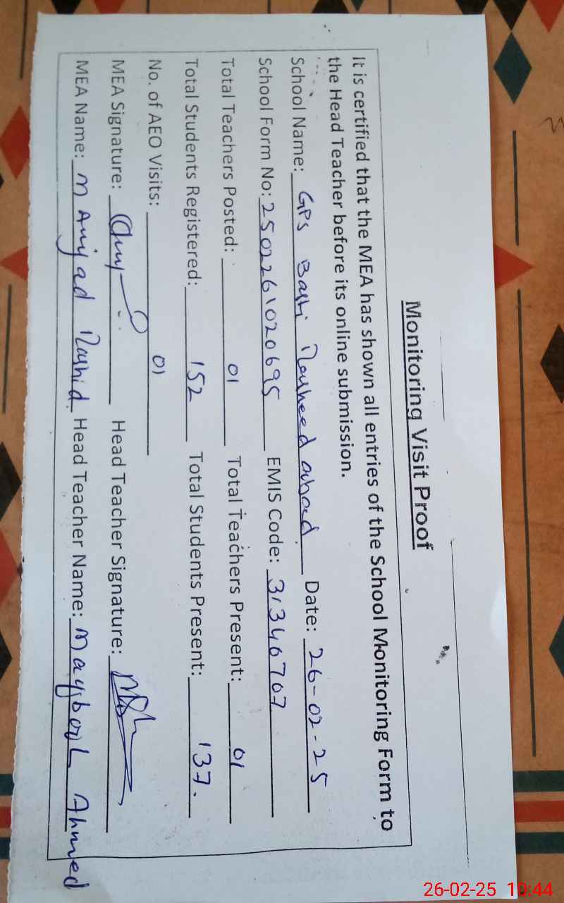 | Certified that this School was Inspected by the Undersigned MEA/DMO Today and the Information Stated Above is as Per Record. | |||||