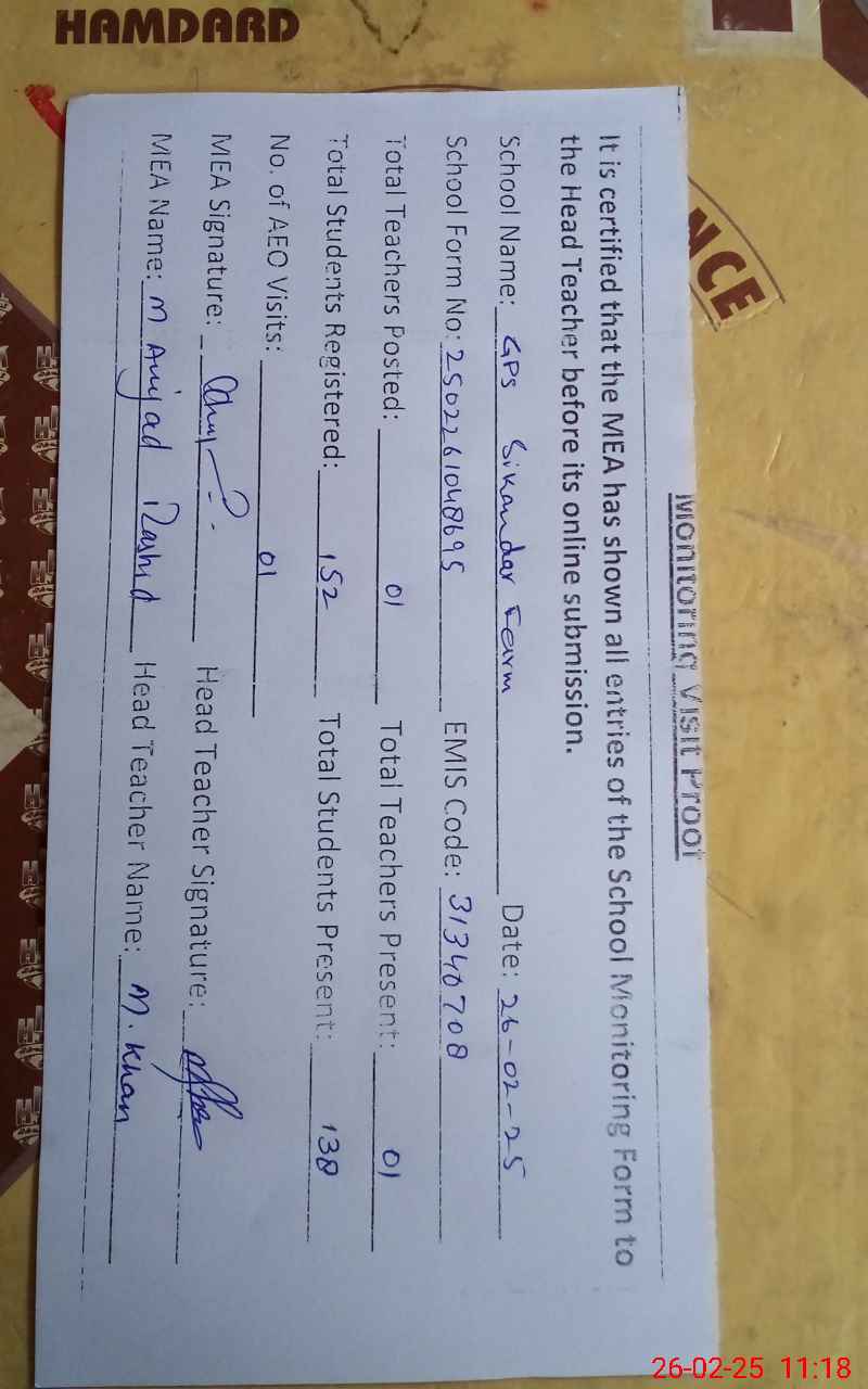 | EMIS Code: 31340708 | Name of School: GPS SAKANDAR FORM BASTI GHUMAN KHAN | |||