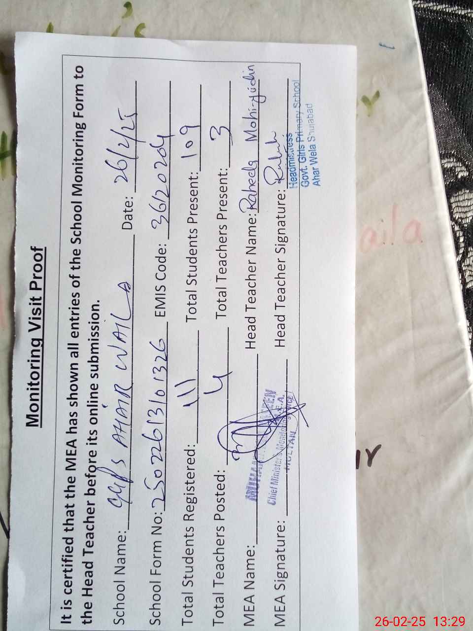 | Attendance Register | Head Teacher | MEA with School | Visit Proof |
