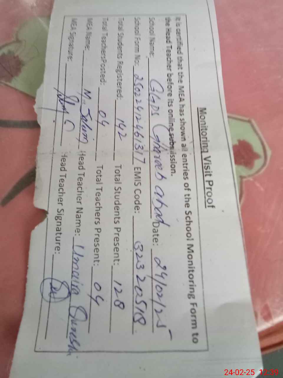 | Attendance Register | Head Teacher | MEA with School | Visit Proof |