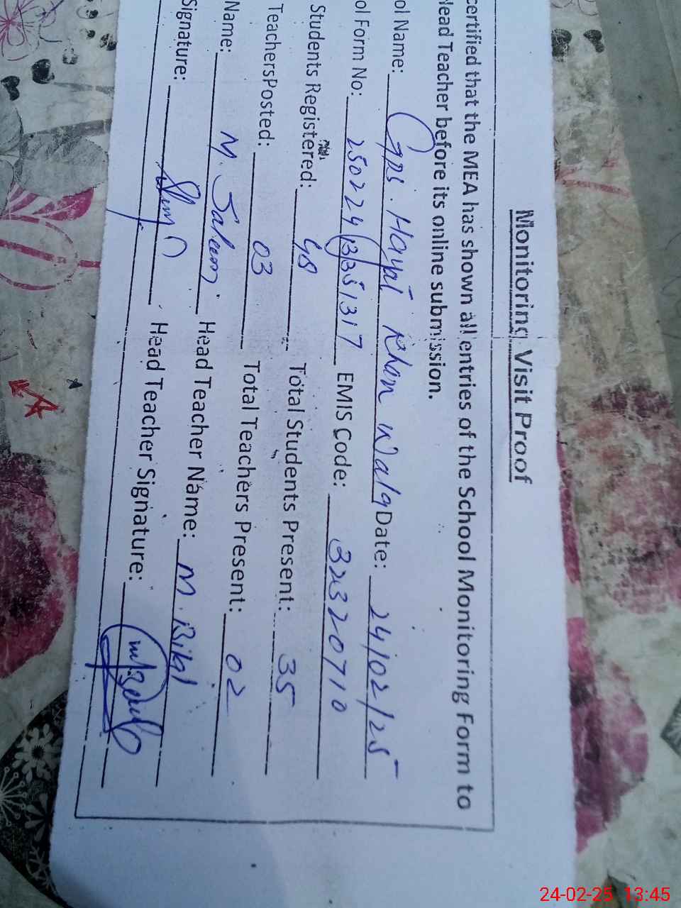 | EMIS Code: 32320710 | Name of School: GPS HAYAT KHAN WALA | |||