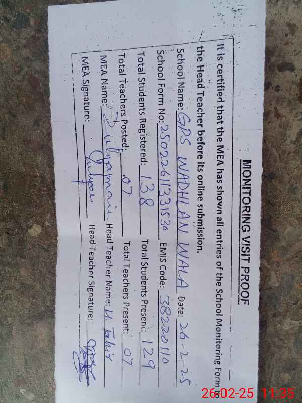 | EMIS Code: 38220110 | Name of School: GPS WADHLAN WALA | |||