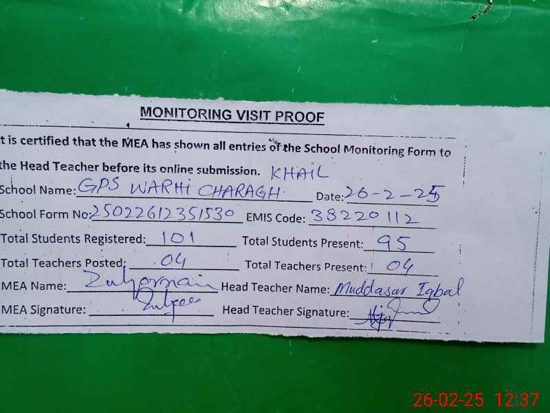 | EMIS Code: 38220112 | Name of School: GPS WARI CHARAGH KHAIL | |||